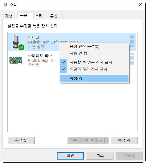 1. 사운드 카드 속성값 열고2. 마이크에서 마우스 올,쪽 버튼 크릭3. 핍업창의 속성 크릭.