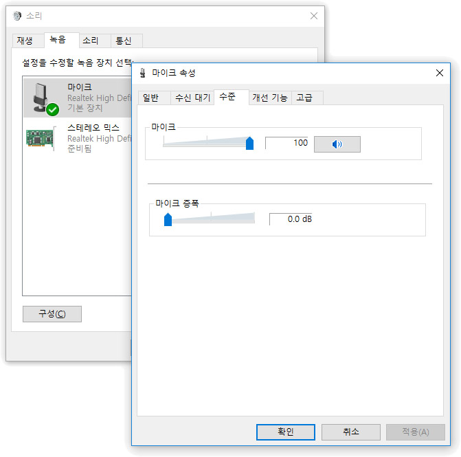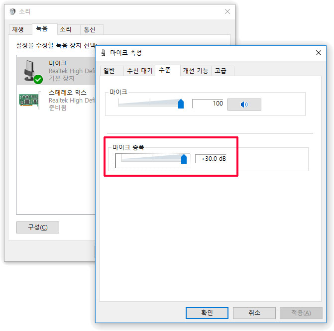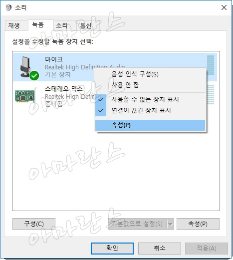 ※ 위이미지는 윈도우10의 마이크 설정 모습입니다. ^^